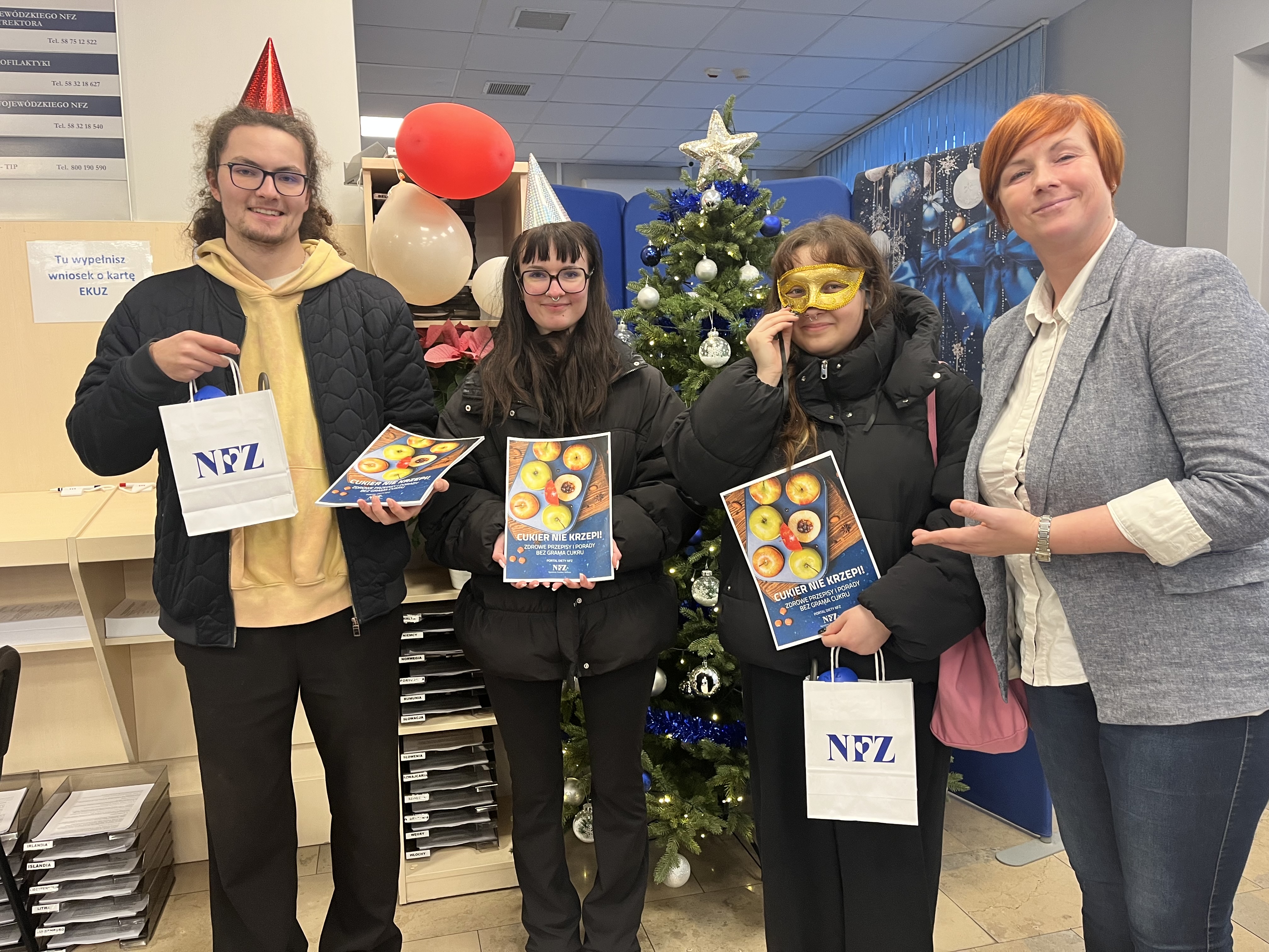 Ostatnimi klientami, którzy odwiedzili Salę Obsługi Klientów Pomorskiego NFZ w starym roku byli: Pan Anton, Pani Wiktoria oraz Pani Paulina. Z kolei nowy rok przywitaliśmy wraz z Panią Beatą oraz z małżeństwem Panią Anną i Panem Markiem,  którzy jako pierwsi przekroczyli próg Sali Obsługi Klientów 2 stycznia 2025 r. Klienci otrzymali drobne upominki – nasze „pakiety zdrowia”, aby 2026 rok był pełen formy i energii.